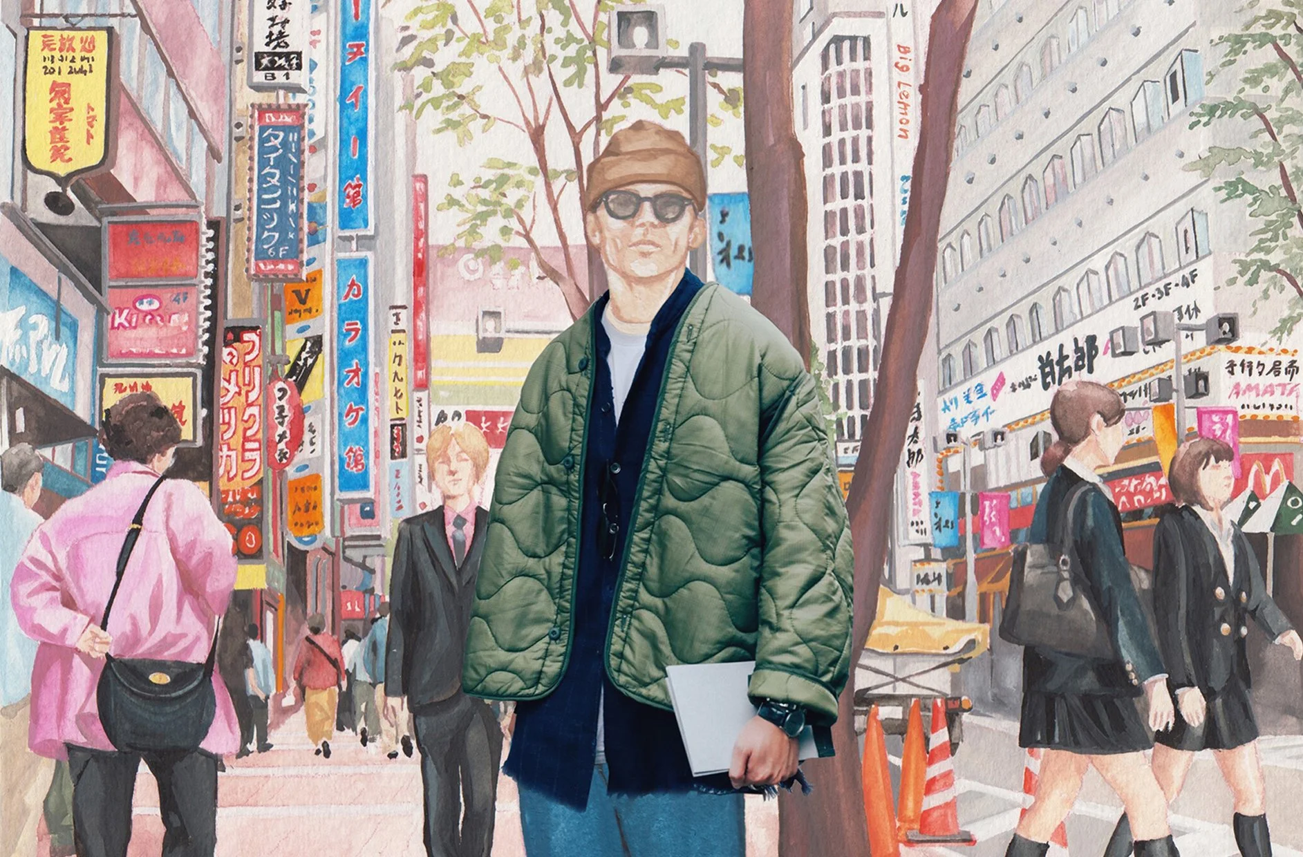 Mixed-media FASHION ILLUSTRATION set on the bustling streets of Tokyo, created to launch a new outerwear collection.