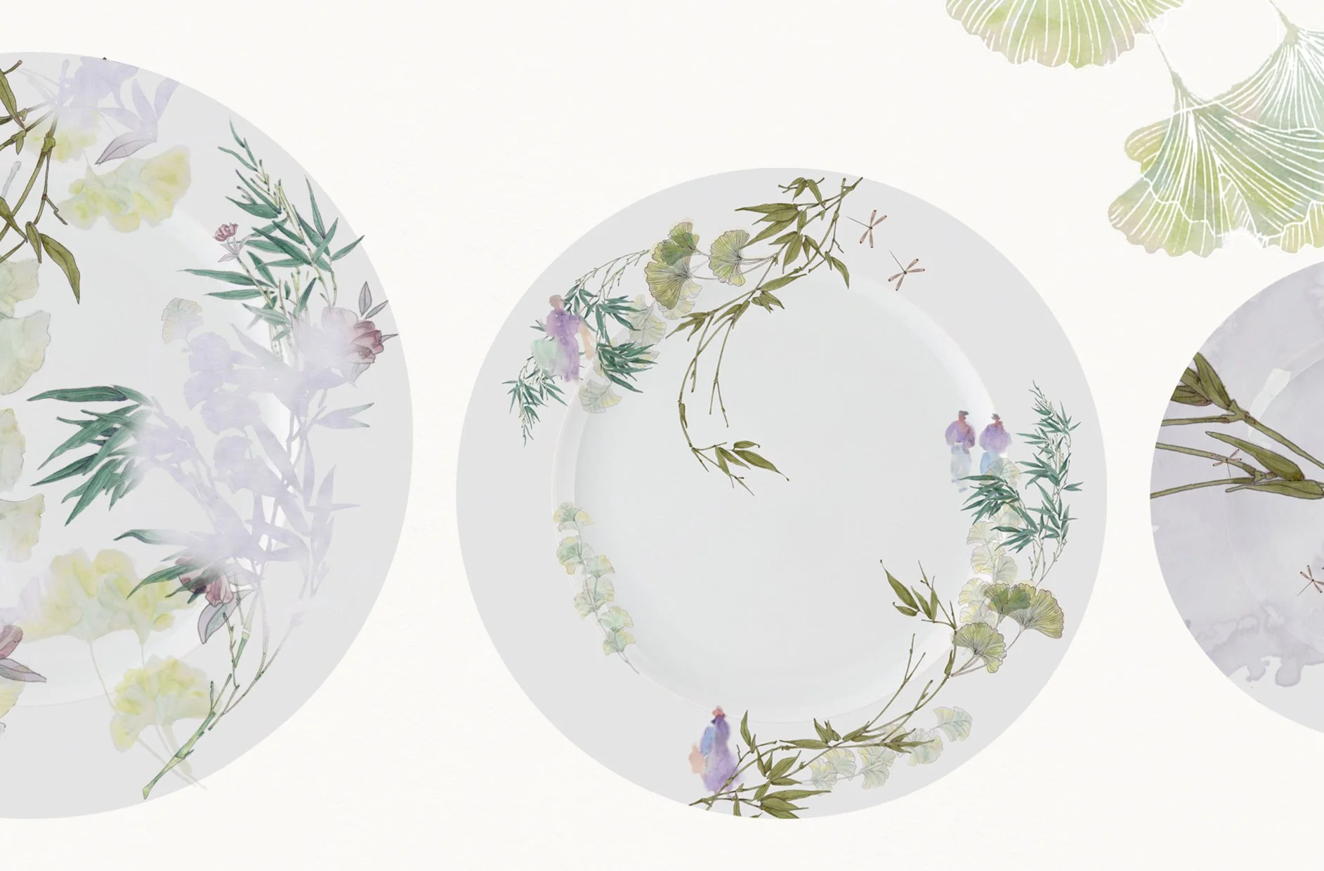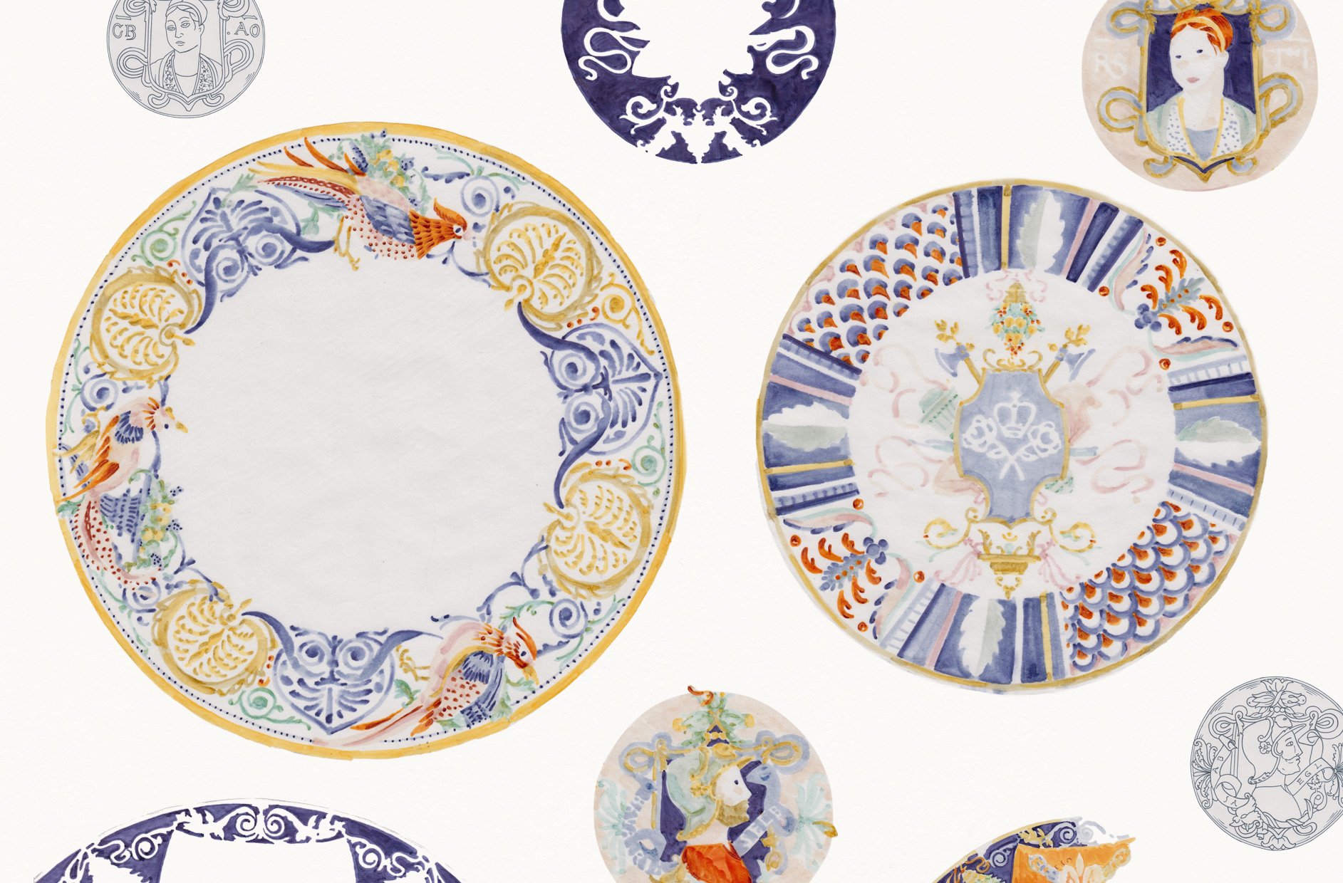 Concept and mixed-media illustration for a dinnerware collection informed by the refined formal language of fine porcelain preserved within the Rosenthal archives.